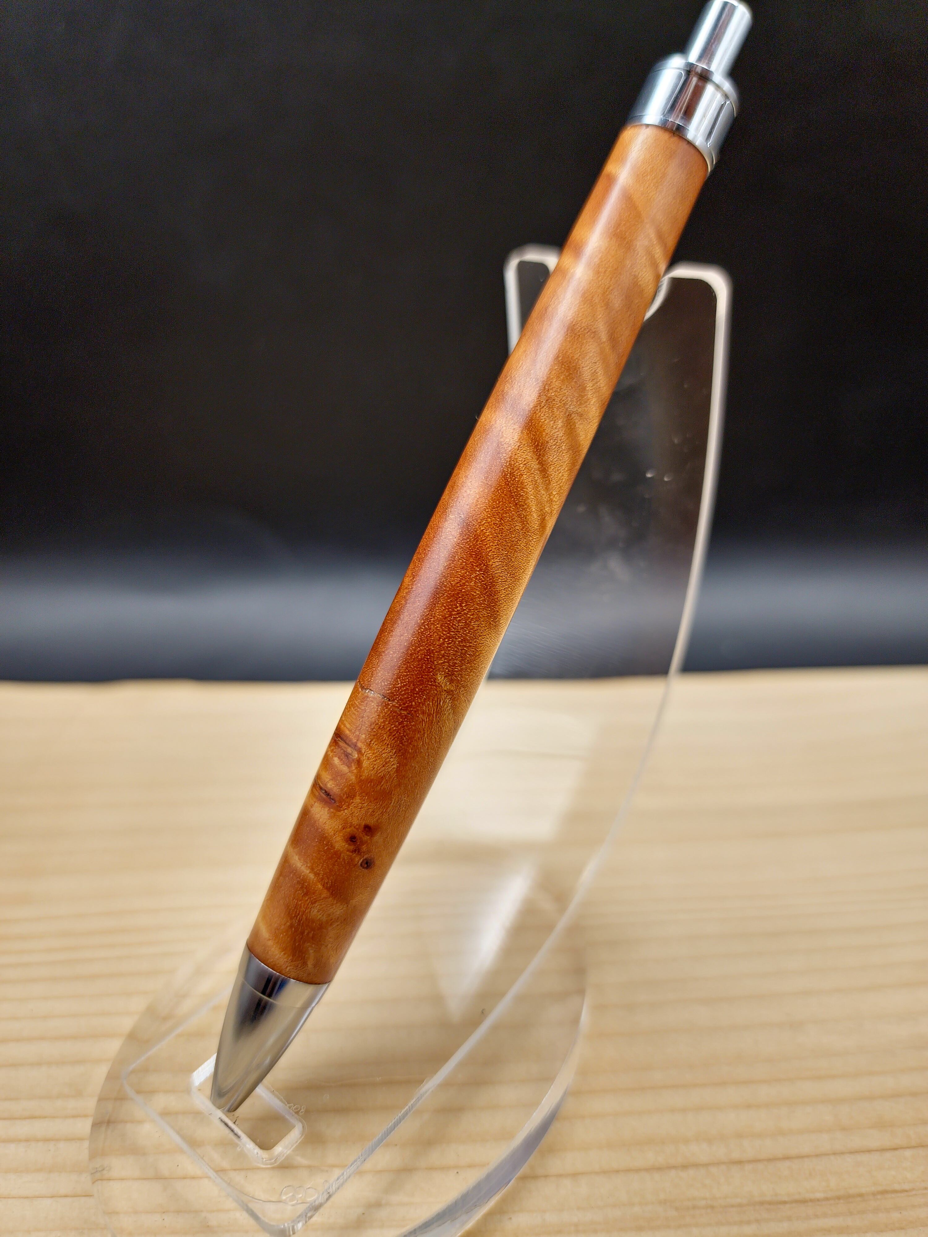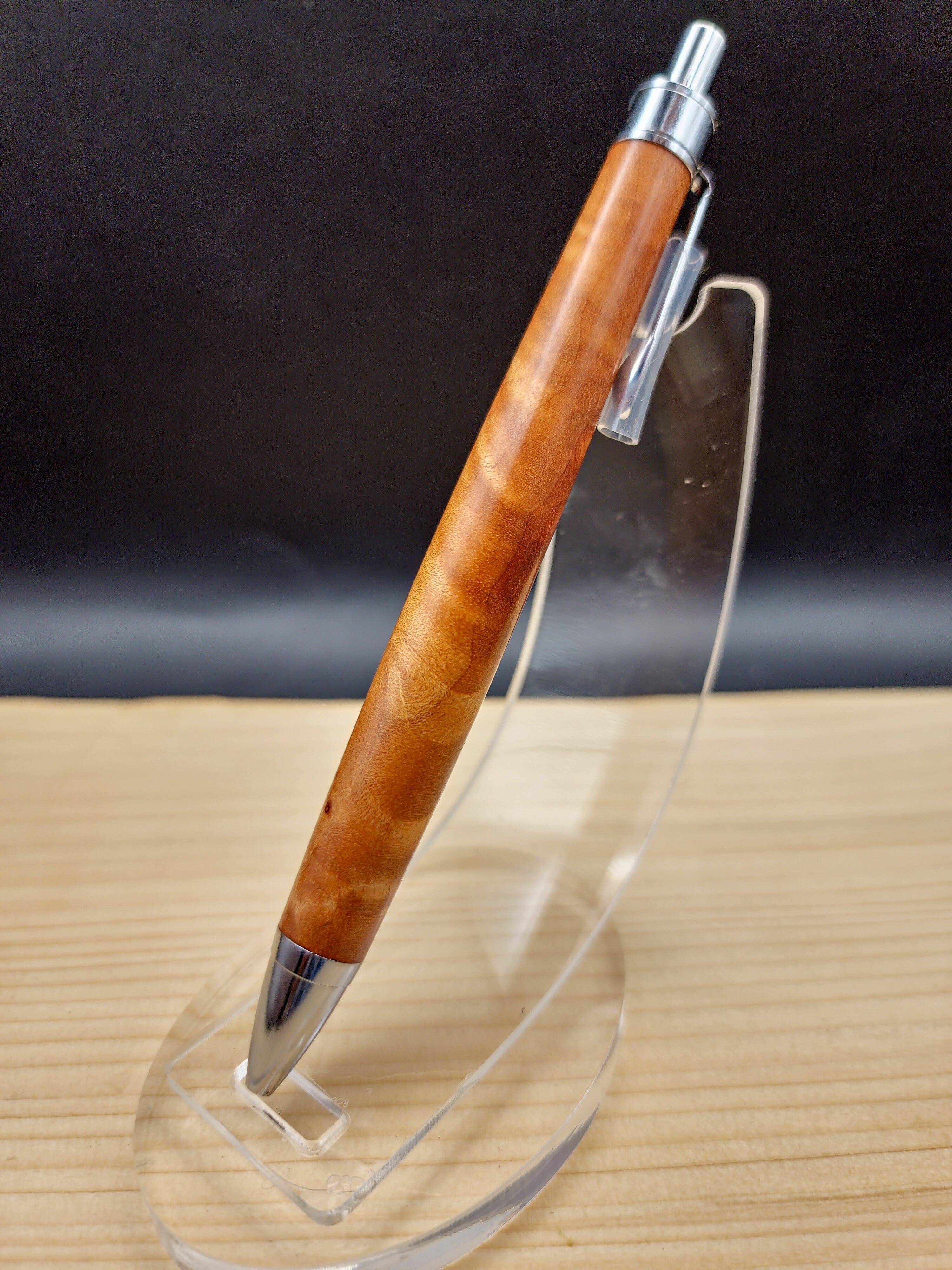 最初はメープルっぽい木目で、そのつもりで在庫保有していましたが削ってみると香りがする材で、バターやマーガリンのような香りが漂い迷宮入りしました。木目が似た材でマドロナがありますが、マドロナであればもっと酸味のある香りと、明るいベージュのような色味が多いはずです。