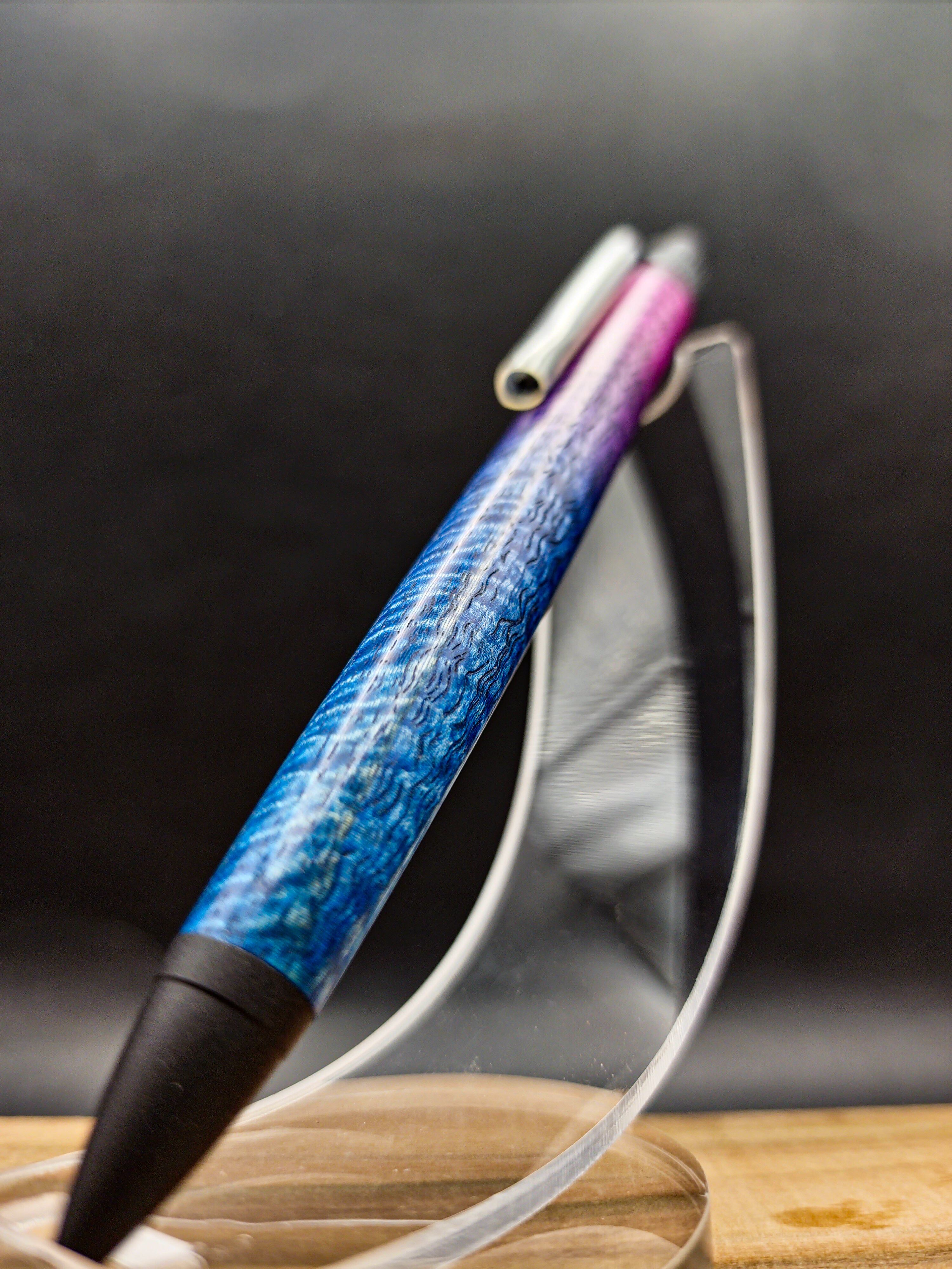 これでもかというほど細かく縮んだ花梨。産地や個体によって色味や材質に差があるようで、この子は色薄めで柔らかめな個体。香りは花梨らしく甘いカリン香がします。部分的にブルーステインが入ることもありますが今回はシラタと赤身のツートンです。