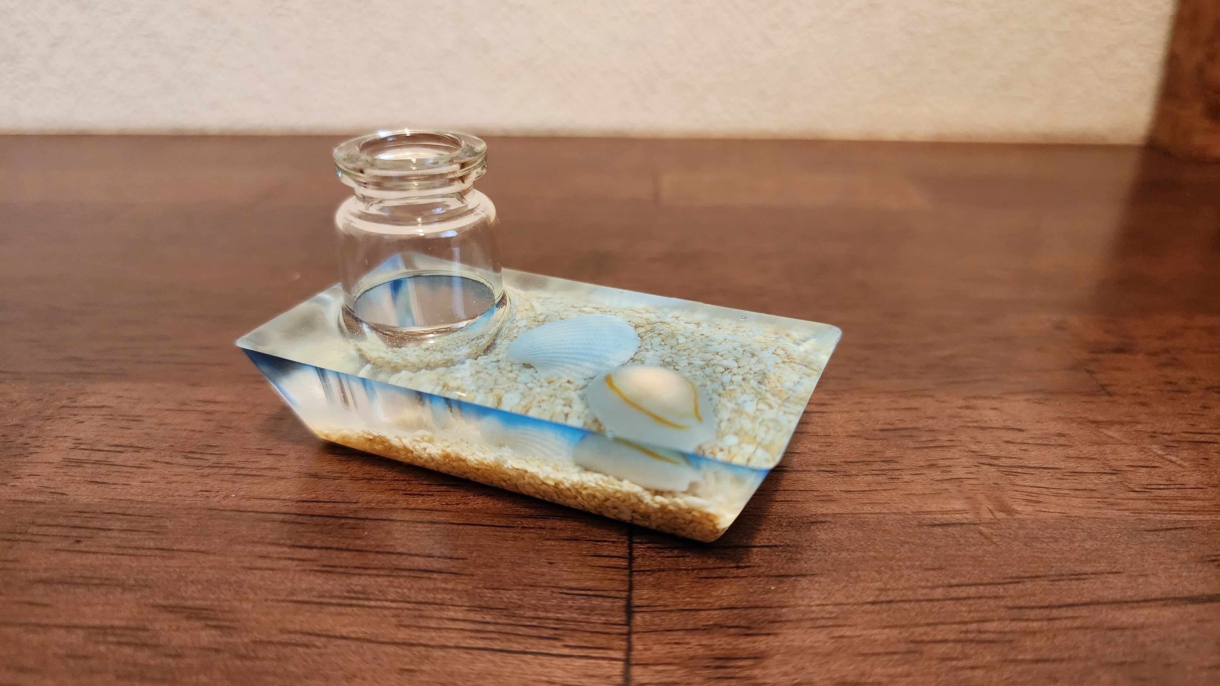 底にはサンゴ砂を、レジンの中には貝殻を封入しております。