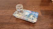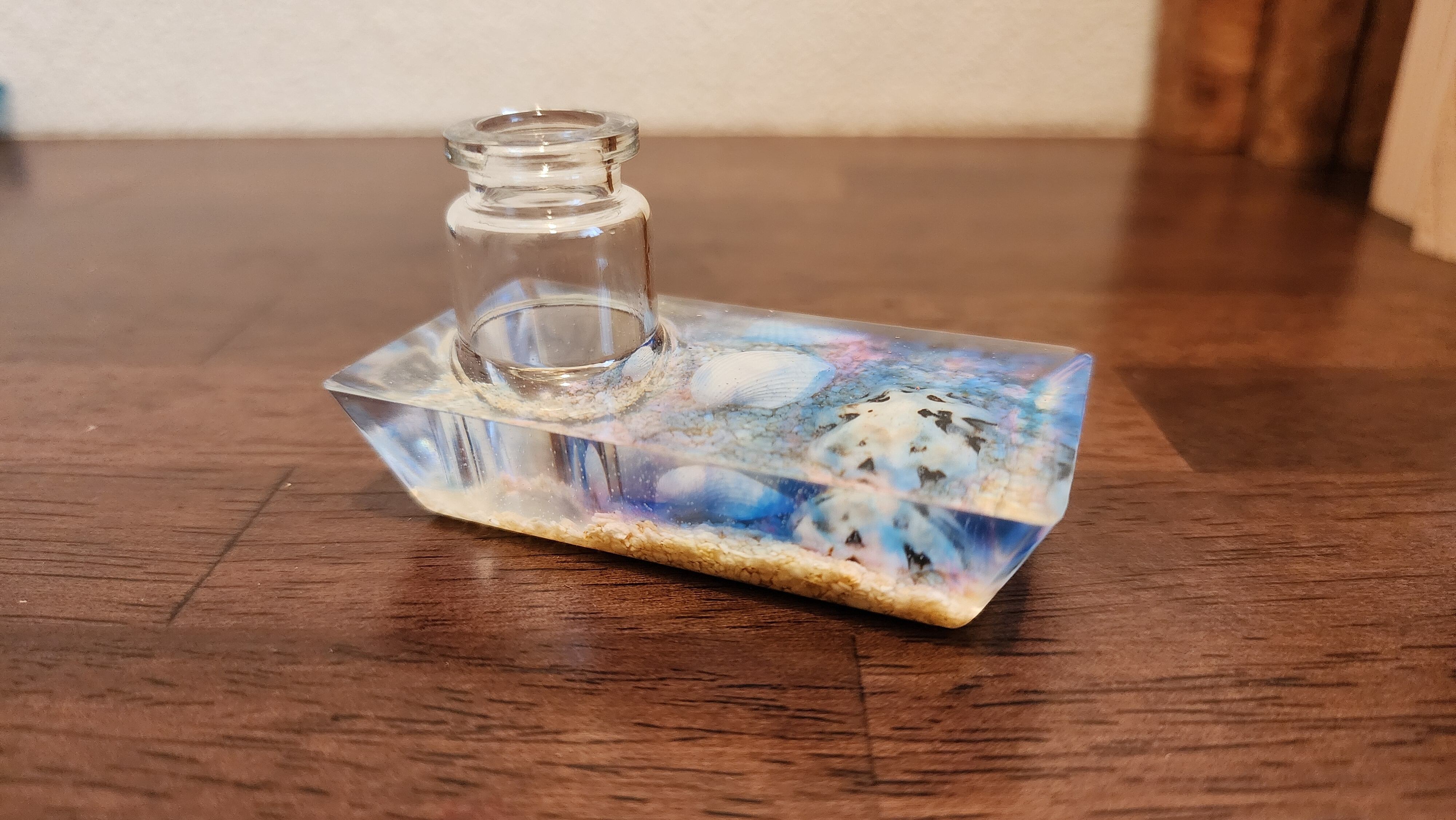 底にはサンゴ砂を、レジンの中には貝殻を封入しております。