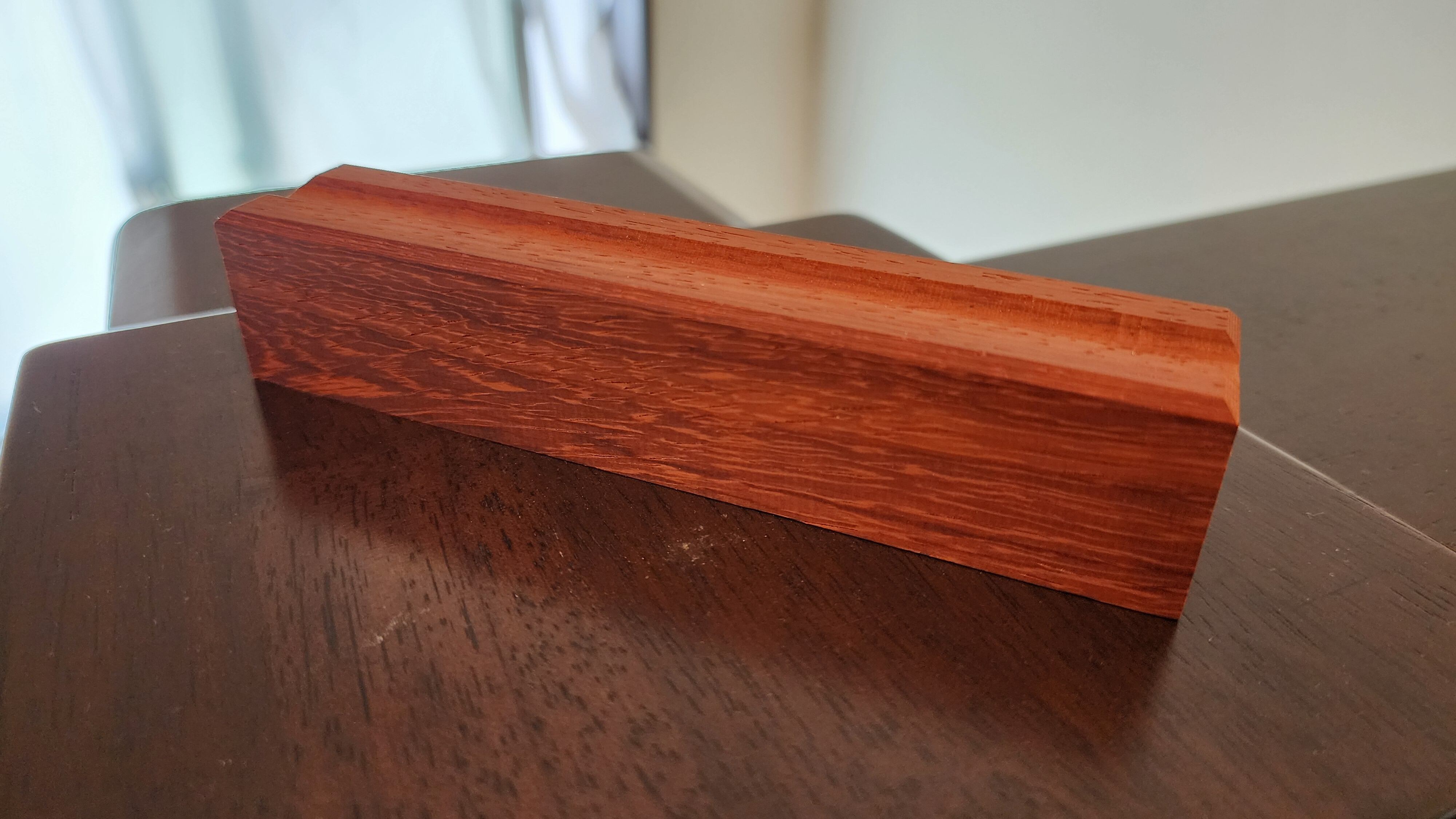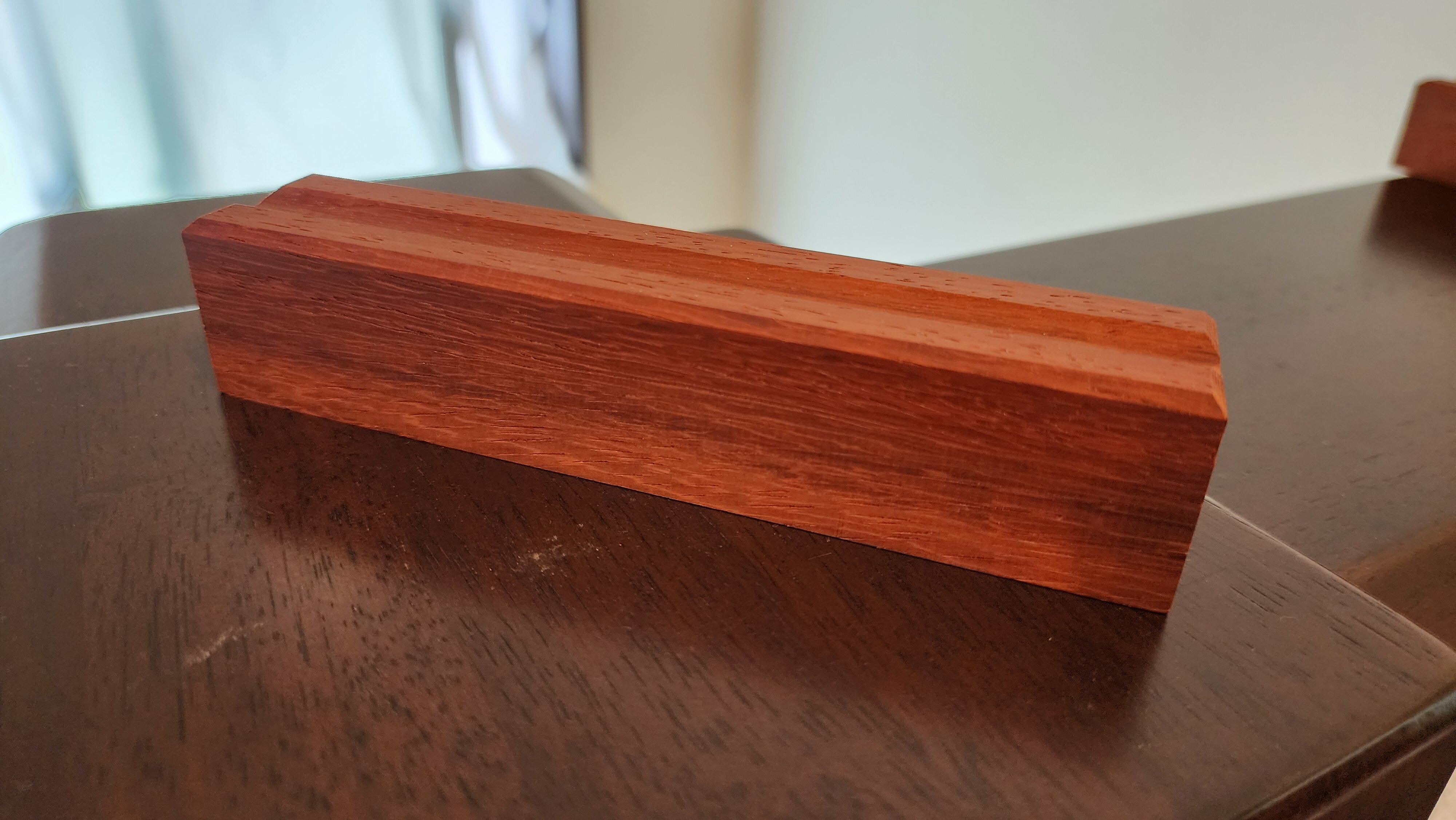 シワシワが出たパドックを使いました。2000番あたりまで磨いていくと、ホログラムのように杢が揺れ動きます。鮮やかな赤が映える一品になります。