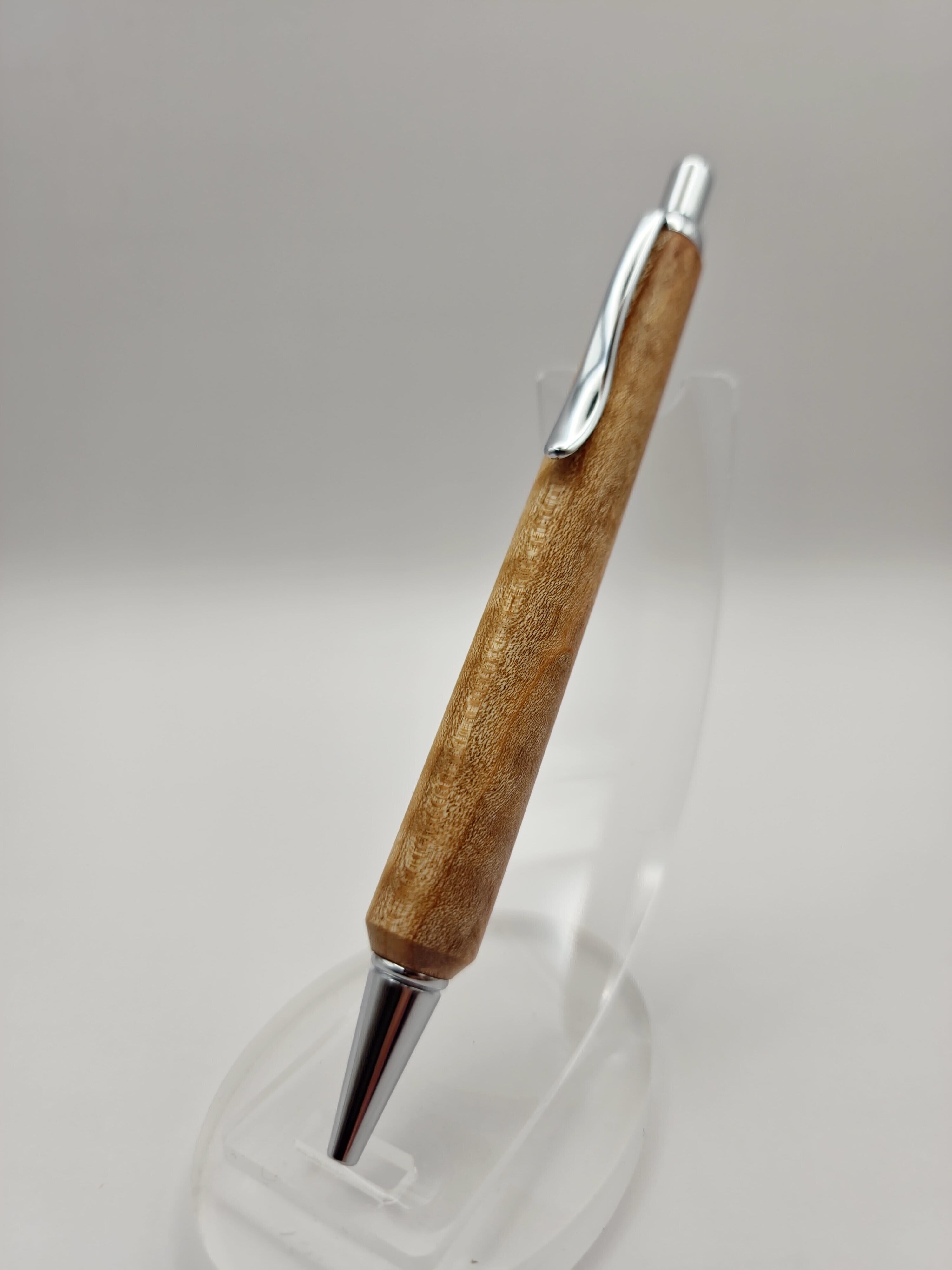 全体的に浅く杢が出ています。温かみのある木目をしており、キラキラ感のある1本です。青入り材のため、メープルながら力強さも感じます。