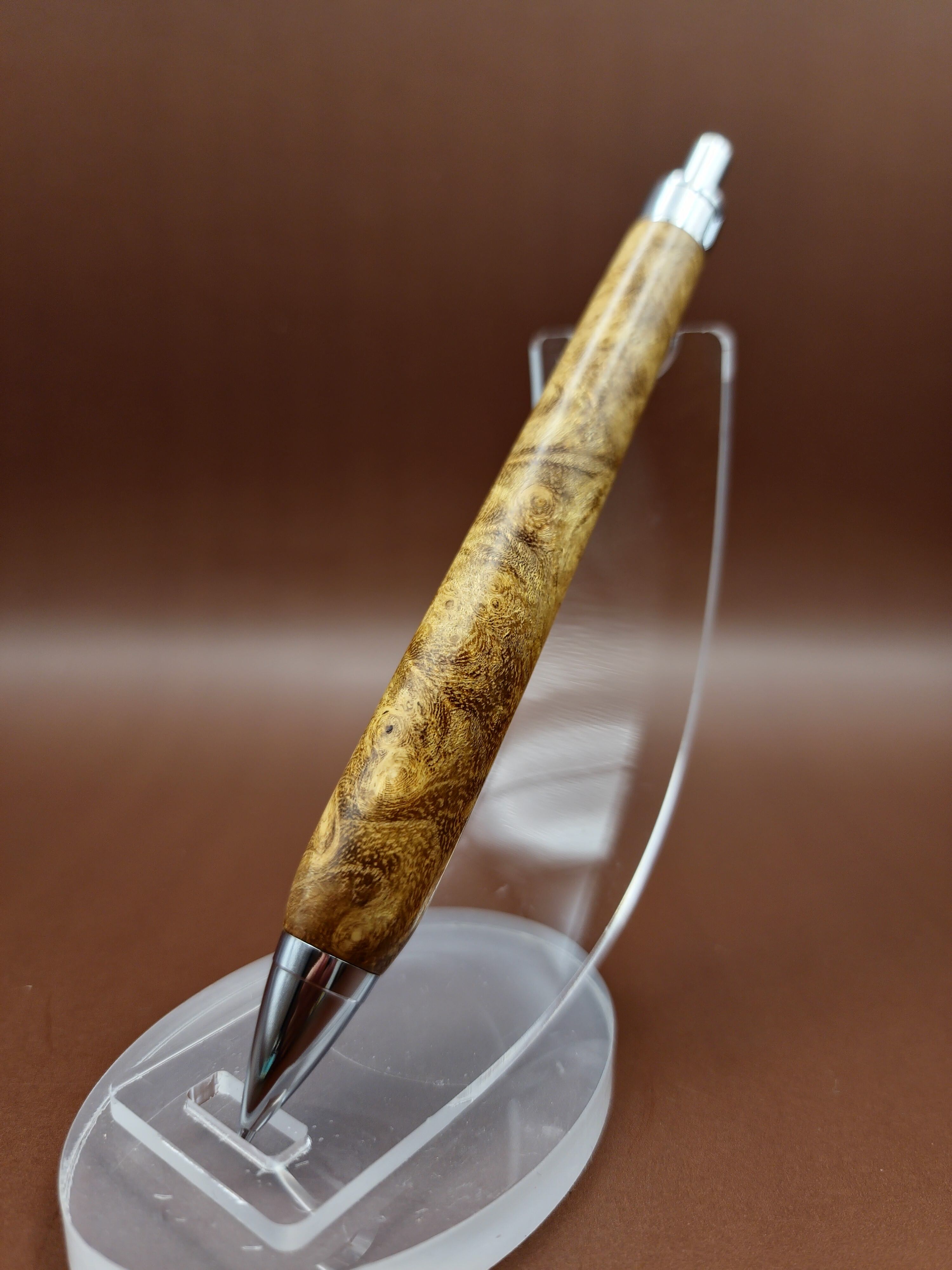 素杢材にあるような金色の輝きと立体的な木目はそのままに、瘤材特有の粒感とうねりが相まって個性になっています。