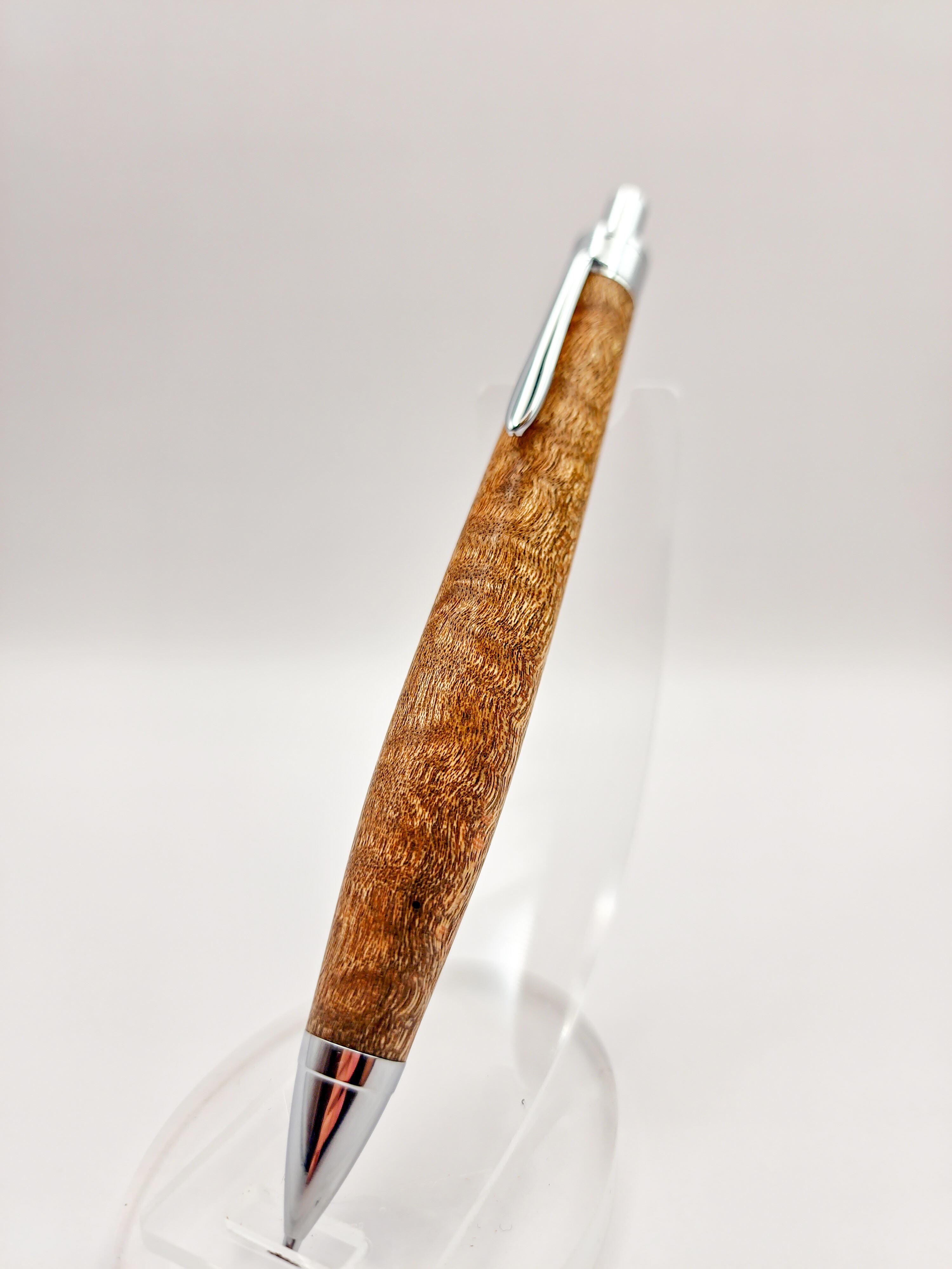 サペリ玉杢を使ったシャープペンシルです。油絵のような複雑な色味をしています。光加減や角度でかなり印象変わる1本ですが期待は裏切らない質感をしています。楽器などで使用される際、塗装されるとまた印象変わりますが磨き一つとっても印象が変わるカメレオン俳優ならぬカメレオン木軸です。経年劣化でも色が深くなる木なので使っていても楽しいと思います。