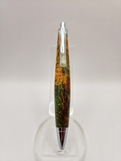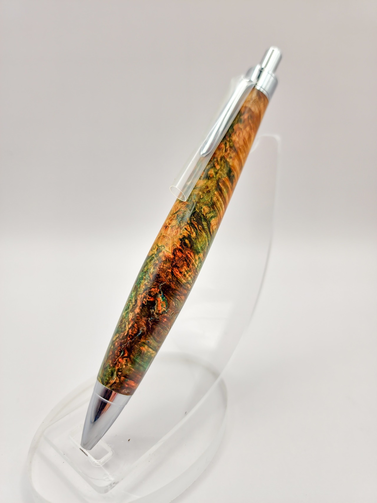 メープルの瘤材に着色した樹脂を含浸させ強度を向上させた、スタビライズドウッドです。素材の色味に加え、青みがかった深い緑やピンク、濃い紫が複雑に入っています。入り皮もあり荒々しく表情のある1本です。スタビライズドウッドですので通常材よりは遅いですが使っていけば艶が出てきて経年変化します。耐久性には優れますのでぜひ日常使いとしてもご検討ください。