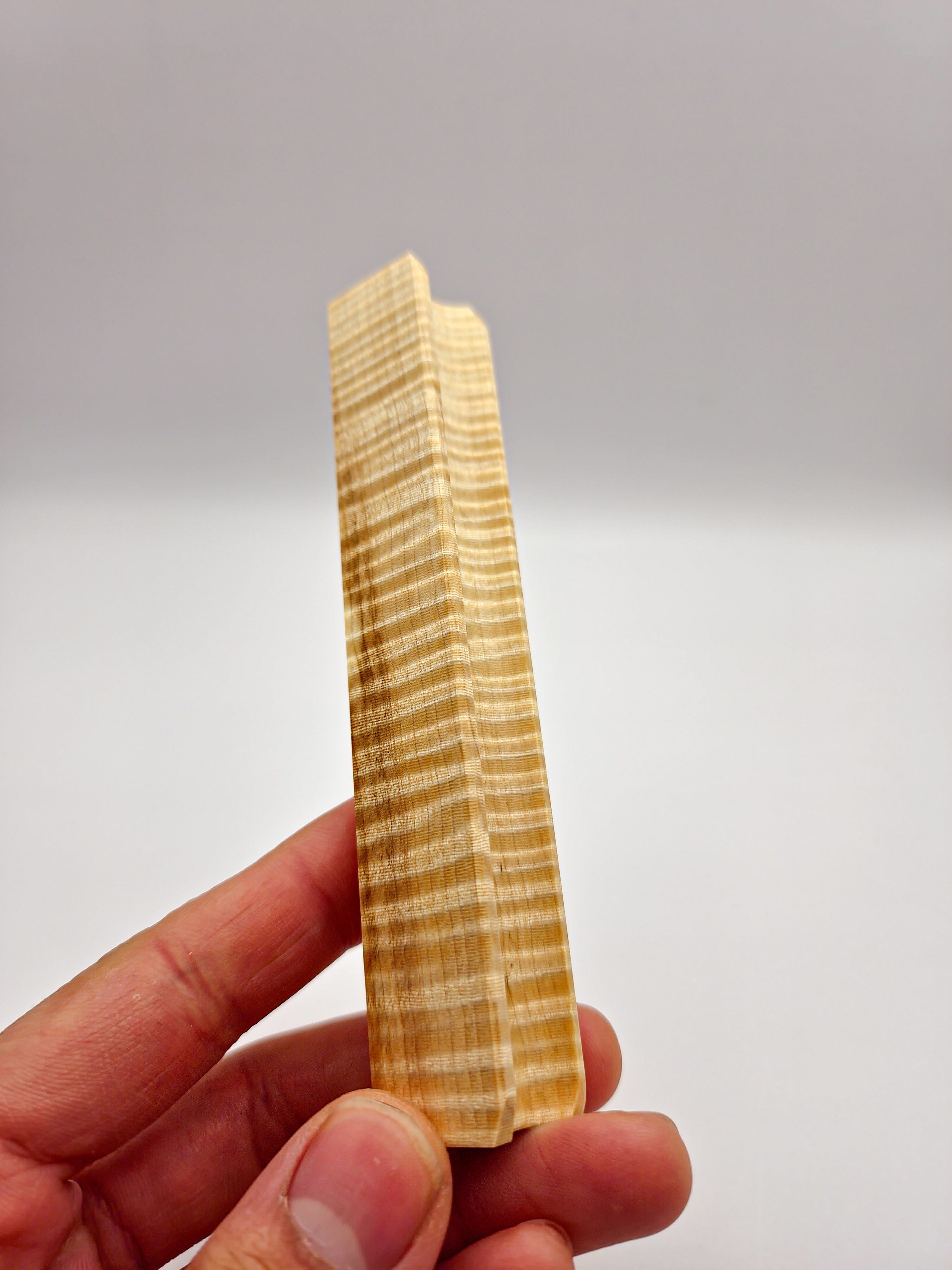 "一寸八縮"ともいわれ、一寸(約3cm)の間に8本の縮みが入ると言われ工芸品の材料として重宝されます。トチや栓によく出る縮杢ですが、良材とされるものは年々数を減らし、そのうえ家具材としても近年白みがかった材が好まれることから需要が増加したため値段が上がってきています。